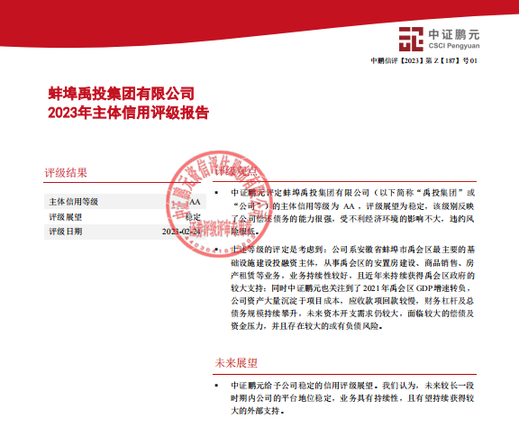 2023年2月24日,蚌埠禹投集團(tuán)有限公司順利榮獲中證鵬元資信評(píng)估股份有限公司評(píng)定的“AA”主體信用評(píng)級(jí),評(píng)級(jí)展望為穩(wěn)定,成為蚌埠市禹會(huì)區(qū)繼蚌埠禹會(huì)建設(shè)投資有限責(zé)任公司后第二家“AA”信用評(píng)級(jí)的國(guó)有企業(yè)。