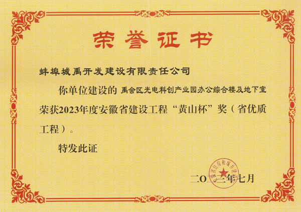 禹會區(qū)光電科創(chuàng)產業(yè)園辦公綜合樓及地下室工程榮獲2023年度安徽省建設工程 “黃山杯”獎