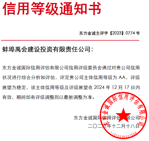 2023年12月18日,蚌埠禹會(huì)建設(shè)投資有限責(zé)任公司(以下簡(jiǎn)稱(chēng)“蚌埠禹會(huì)建投公司”)獲取“東方金誠(chéng)國(guó)際信用評(píng)估有限公司”主體信用AA評(píng)定,評(píng)級(jí)展望為穩(wěn)定。