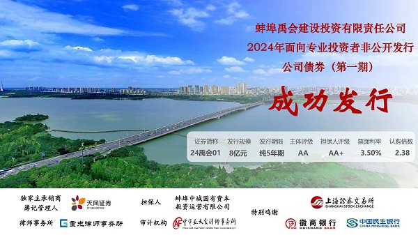 2024年11月7日,蚌埠禹投集團(tuán)有限公司所屬子公司蚌埠禹會(huì)建設(shè)投資有限責(zé)任公司面向?qū)I(yè)投資者成功發(fā)行8億元非公開公司債券(第一期)。本次債券由天風(fēng)證券股份有限公司負(fù)責(zé)承銷,蚌埠中城國有資本投資運(yùn)營有限公司提供擔(dān)保,發(fā)行期限5年,利率3.5%。